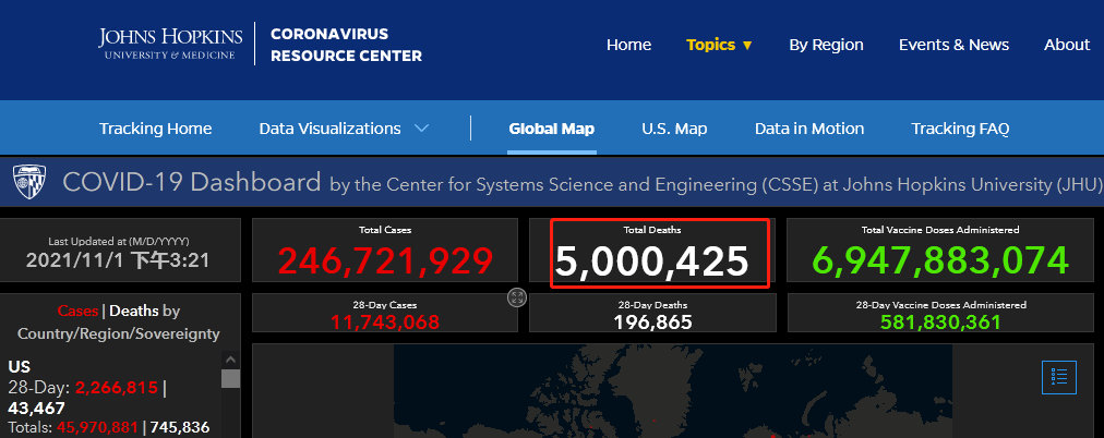 【全球网疾讯】据美邦约翰·霍普金斯大学及时数据显示,截至北京时代11月1日16时50分,环球因新冠病毒累计去世人数赶上500万例,累计确诊人数达246721929。此中美邦累计去世人数745836例。